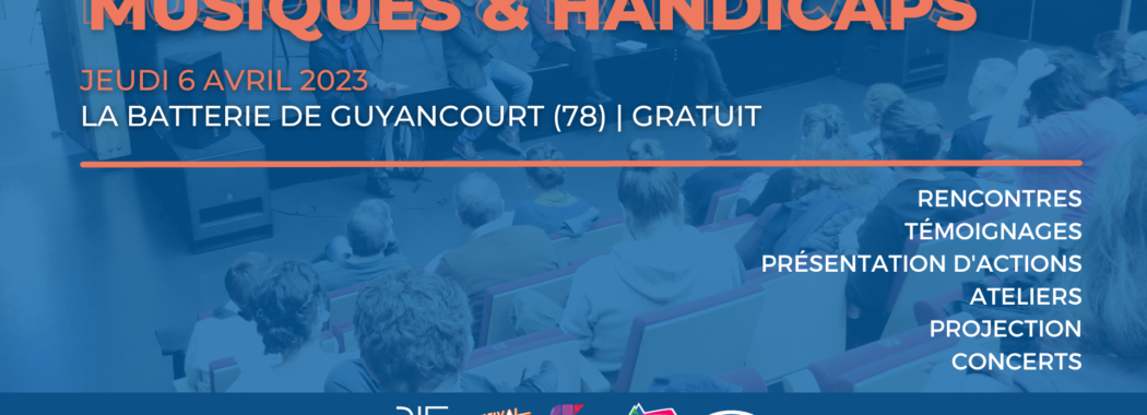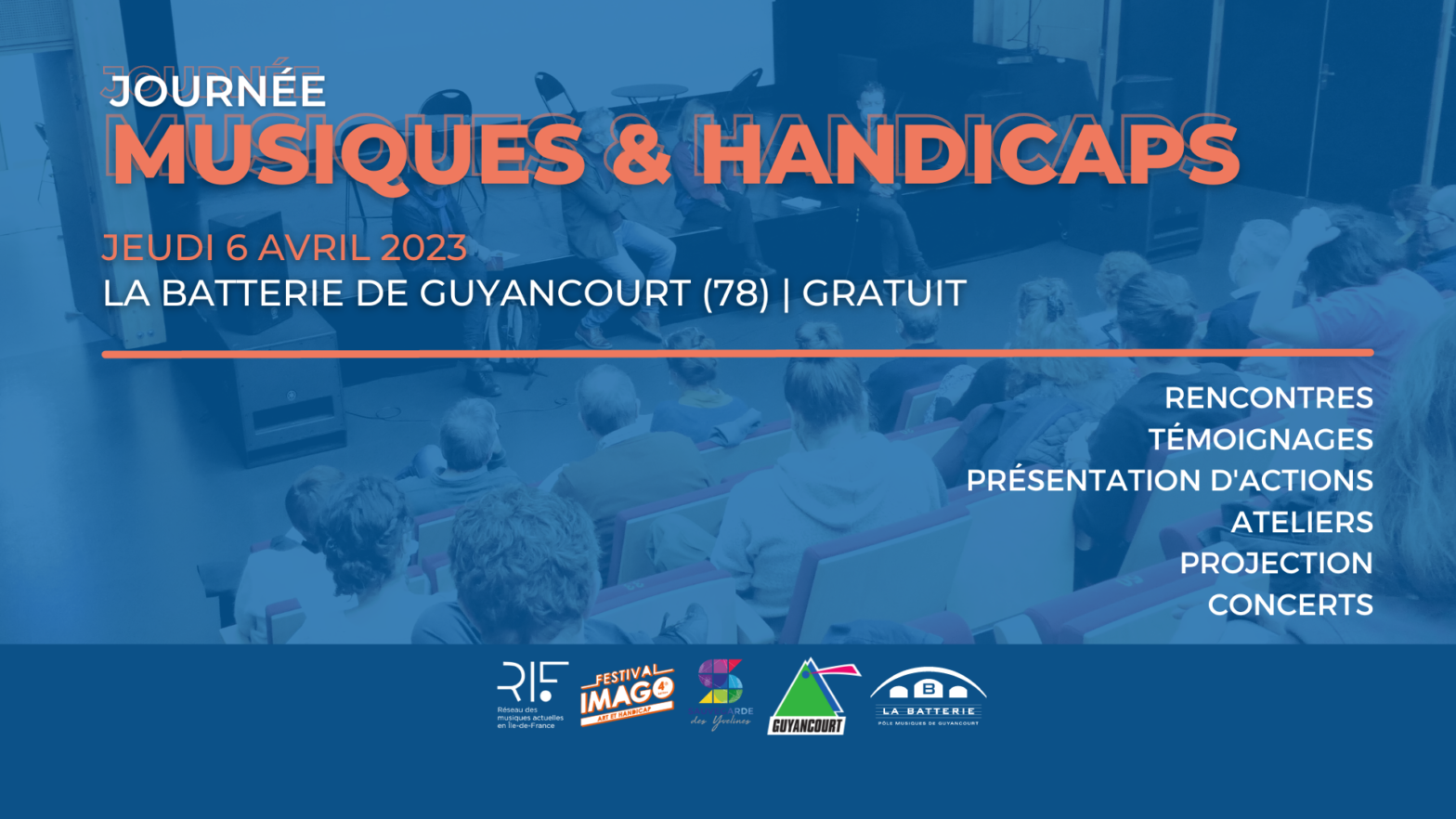 Le RIF, le Pôle Art et Handicap 78/92, le Festival IMAGO et la ville de Guyancourt organisent une rencontre « Musiques & Handicaps » jeudi 6 avril 2023 de 9h30 à 21h30 à La Batterie de Guyancourt (78).