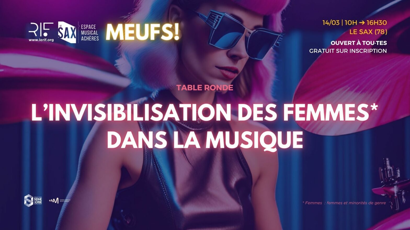 Dans le cadre du projet des adhérents yvelinois MEUFS!, une table ronde est organisée jeudi 14 mars 2024 au SAX (78) afin d’échanger autour de la place des femmes* dans la musique. Elle est OUVERTE A TOU·TES, musicien·nes, professionnel·les et/ou curieux·ses !